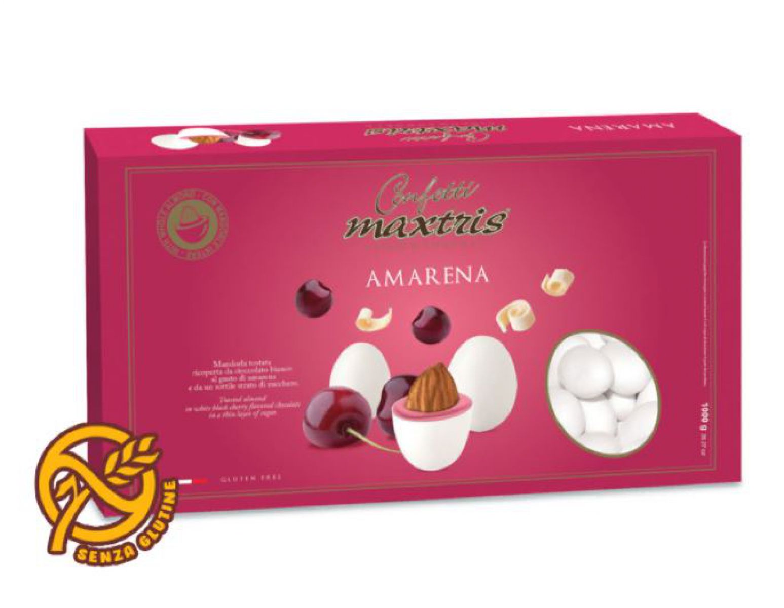 Mandorla tostata avvolta da uno strato di cioccolato all'amarena,ricoperta da un sottile strato di zucchero.