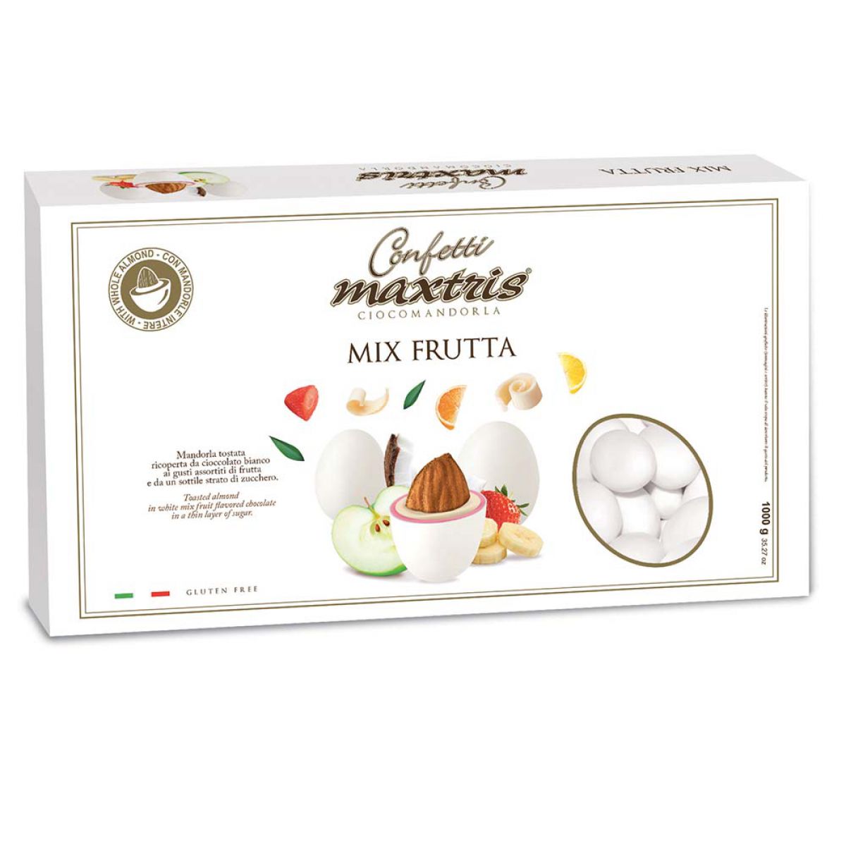 Mandorla tostata avvolta da uno strato di cioccolato ai vari gusti di frutta,ricoperta da un sottile strato di zucchero.