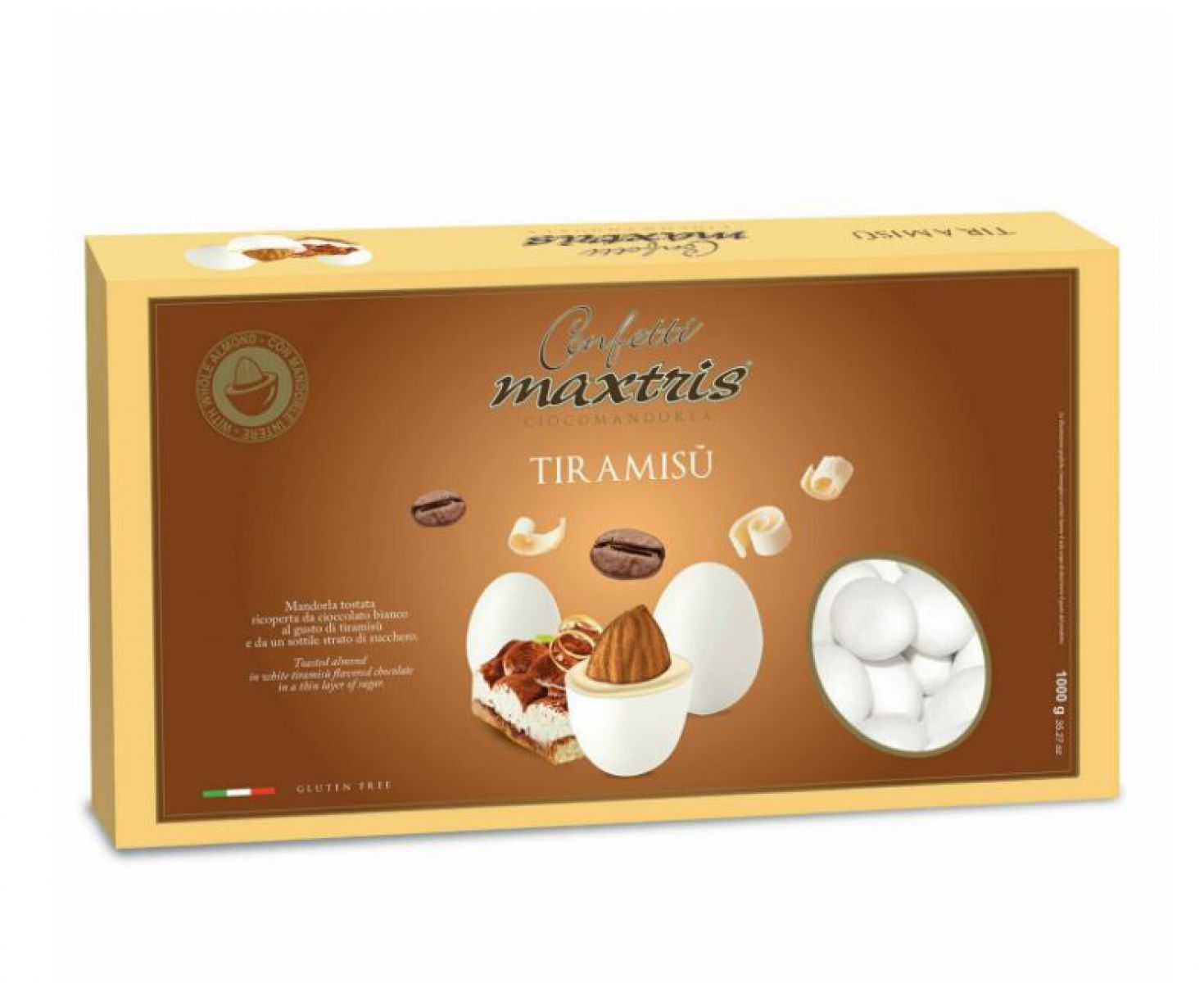 Mandorla tostata avvolta da uno strato di cioccolato al gusto di tiramisù,ricoperta da uno strato di zucchero.