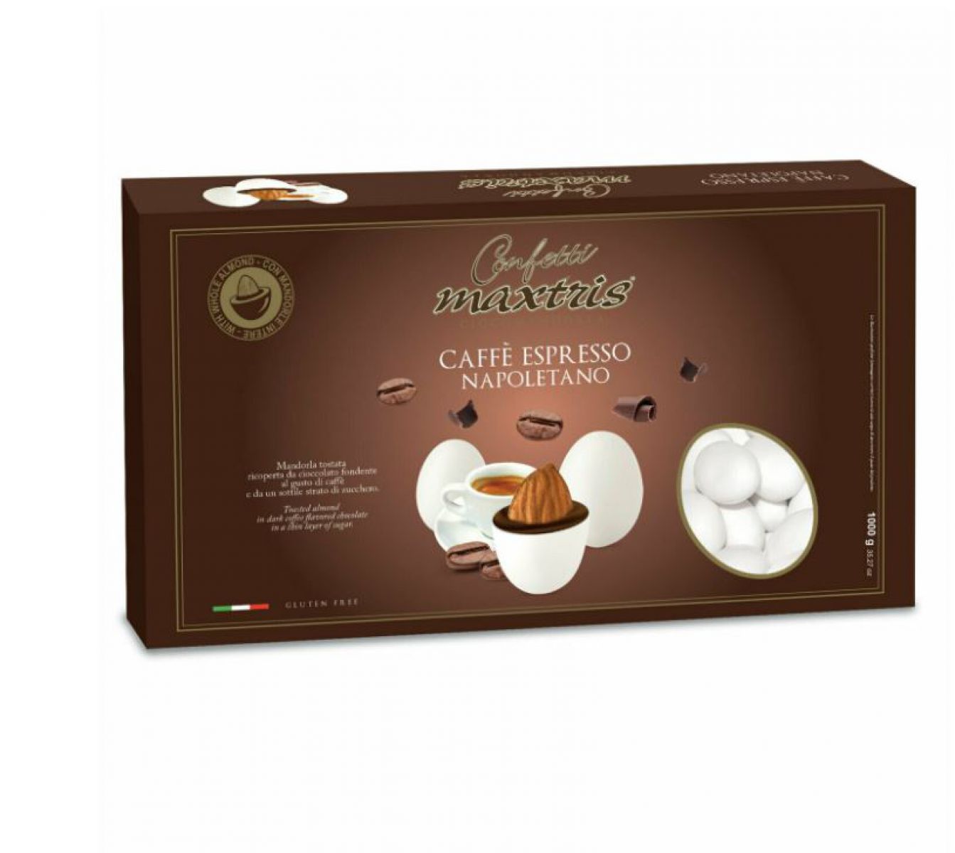 Mandorla tostata avvolta da uno strato di cioccolato fondente al gusto caffè,ricoperta da uno strato di zucchero.